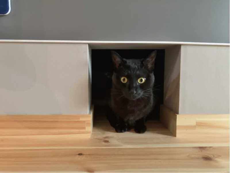 レンとサブレは、引っ越してからしばらく興味深々といった感じでしたが、トイレをセットすると直ぐに使用してくれたので、嬉しさと安心でいっぱいになりました。内心使ってくれなかったらどうしよう?と思ってました。キッチンの背面のFix窓は、部屋の明り取りとしてオプションでつけたんですが、今はサブレがFix窓から毎朝外を眺めるというルーティンになっています。その姿を見ると朝から、とても癒されると同時に、COVACOに住んで良かったと思える瞬間です。レンは、南側のウッドデッキがある大きな窓から外を眺めるのが大好きです。寒い時期になると、サブレもここで日向ぼっこしています。無垢の床はとても暖かく、愛猫の爪でキズがありますが愛着がわきます。多少のキズも気になりませんが、引っかかる場合はサンドペーパーで擦ると気にならないくらいです。以前の住まいと違い、猫も健康で満足していることがわかり安心してます。